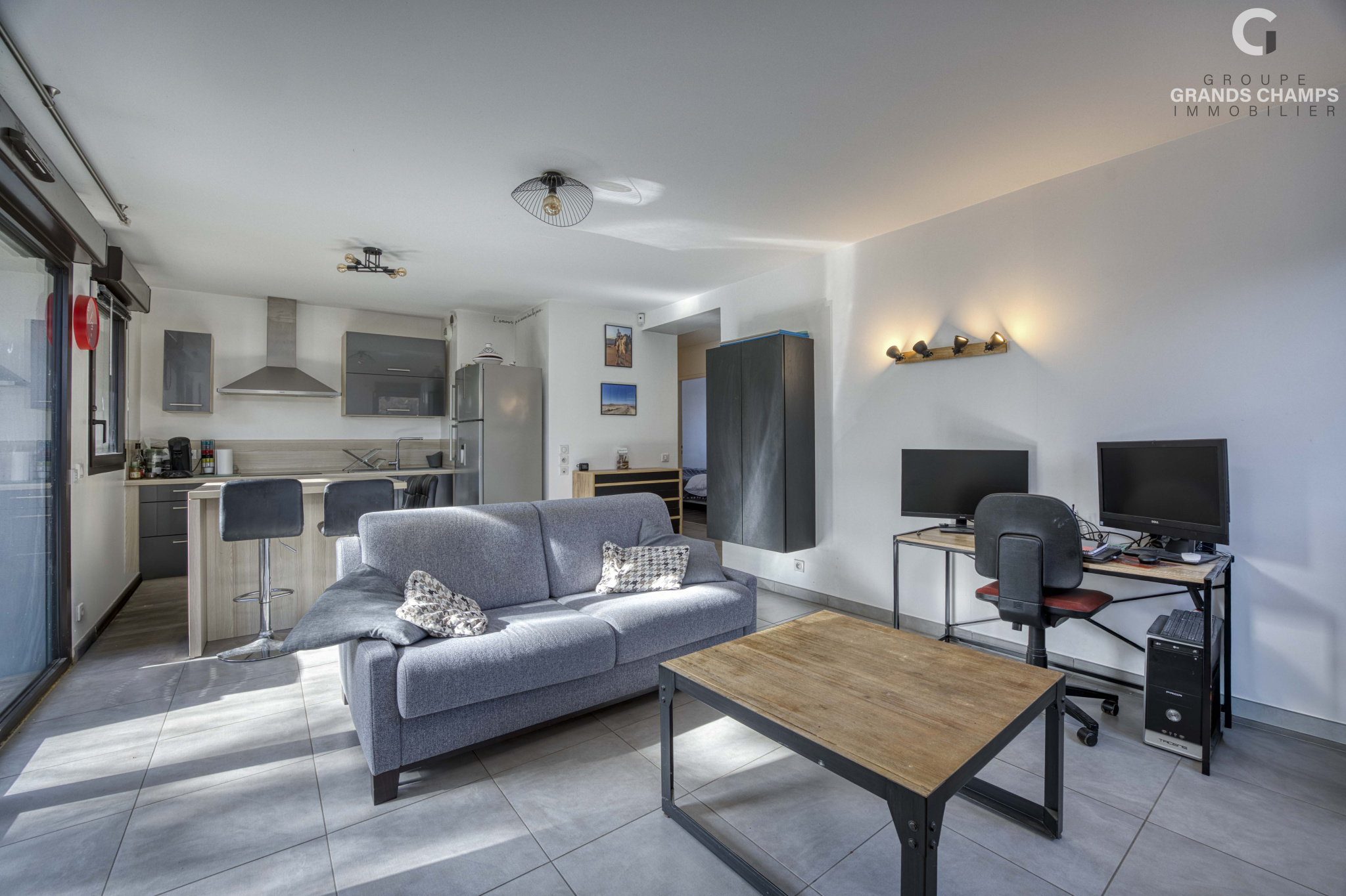 La pièce de vie lumineuse accueille un séjour convivial avec cuisine ouverte, aménagée et équipée, offrant un espace fonctionnel et agréable au quotidien.
